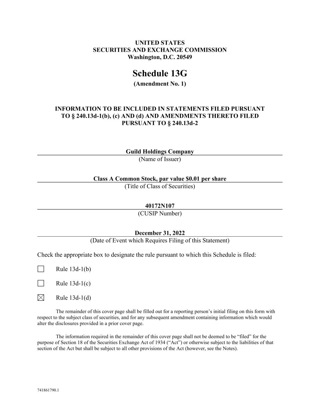 741861790.1 UNITED STATES SECURITIES AND EXCHANGE COMMISSION Washington, D.C. 20549 Schedule 13G (Amendment No. 1) INFORMATION TO BE INCLUDED IN STATEMENTS FILED PURSUANT TO § 240.13d-1(b), (c) AND (d) AND AMENDMENTS THERETO FILED PURSUANT TO § 240.13d-2 Guild Holdings Company (Name of Issuer) Class A Common Stock, par value $0.01 per share (Title of Class of Securities) 40172N107 (CUSIP Number) December 31, 2022 (Date of Event which Requires Filing of this Statement) Check the appropriate box to designate the rule pursuant to which this Schedule is filed: Rule 13d-1(b) Rule 13d-1(c) Rule 13d-1(d) The remainder of this cover page shall be filled out for a reporting person’s initial filing on this form with respect to the subject class of securities, and for any subsequent amendment containing information which would alter the disclosures provided in a prior cover page. The information required in the remainder of this cover page shall not be deemed to be “filed” for the purpose of Section 18 of the Securities Exchange Act of 1934 (“Act”) or otherwise subject to the liabilities of that section of the Act but shall be subject to all other provisions of the Act (however, see the Notes).