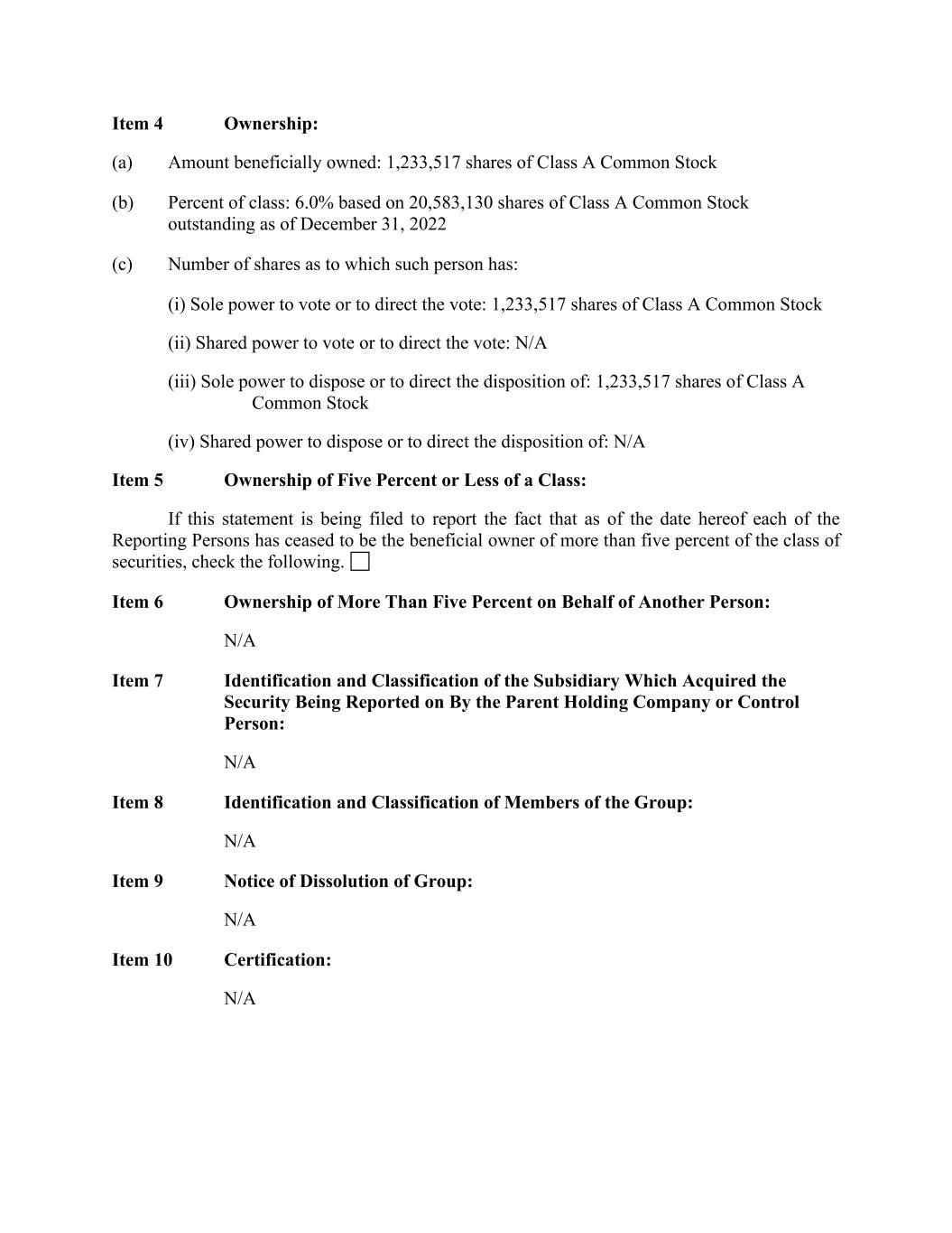 Item 4 Ownership: (a) Amount beneficially owned: 1,233,517 shares of Class A Common Stock (b) Percent of class: 6.0% based on 20,583,130 shares of Class A Common Stock outstanding as of December 31, 2022 (c) Number of shares as to which such person has: (i) Sole power to vote or to direct the vote: 1,233,517 shares of Class A Common Stock (ii) Shared power to vote or to direct the vote: N/A (iii) Sole power to dispose or to direct the disposition of: 1,233,517 shares of Class A Common Stock (iv) Shared power to dispose or to direct the disposition of: N/A Item 5 Ownership of Five Percent or Less of a Class: If this statement is being filed to report the fact that as of the date hereof each of the Reporting Persons has ceased to be the beneficial owner of more than five percent of the class of securities, check the following. Item 6 Ownership of More Than Five Percent on Behalf of Another Person: N/A Item 7 Identification and Classification of the Subsidiary Which Acquired the Security Being Reported on By the Parent Holding Company or Control Person: N/A Item 8 Identification and Classification of Members of the Group: N/A Item 9 Notice of Dissolution of Group: N/A Item 10 Certification: N/A