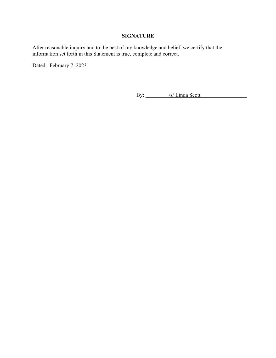 SIGNATURE After reasonable inquiry and to the best of my knowledge and belief, we certify that the information set forth in this Statement is true, complete and correct. Dated: February 7, 2023 By: /s/ Linda Scott