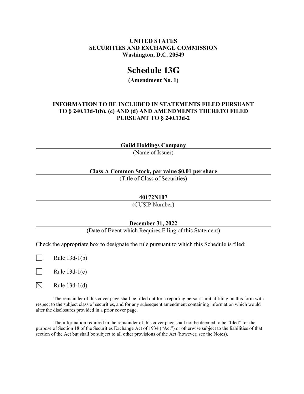 UNITED STATES SECURITIES AND EXCHANGE COMMISSION Washington, D.C. 20549 Schedule 13G (Amendment No. 1) INFORMATION TO BE INCLUDED IN STATEMENTS FILED PURSUANT TO § 240.13d-1(b), (c) AND (d) AND AMENDMENTS THERETO FILED PURSUANT TO § 240.13d-2 Guild Holdings Company (Name of Issuer) Class A Common Stock, par value $0.01 per share (Title of Class of Securities) 40172N107 (CUSIP Number) December 31, 2022 (Date of Event which Requires Filing of this Statement) Check the appropriate box to designate the rule pursuant to which this Schedule is filed: Rule 13d-1(b) Rule 13d-1(c) Rule 13d-1(d) The remainder of this cover page shall be filled out for a reporting person’s initial filing on this form with respect to the subject class of securities, and for any subsequent amendment containing information which would alter the disclosures provided in a prior cover page. The information required in the remainder of this cover page shall not be deemed to be “filed” for the purpose of Section 18 of the Securities Exchange Act of 1934 (“Act”) or otherwise subject to the liabilities of that section of the Act but shall be subject to all other provisions of the Act (however, see the Notes).