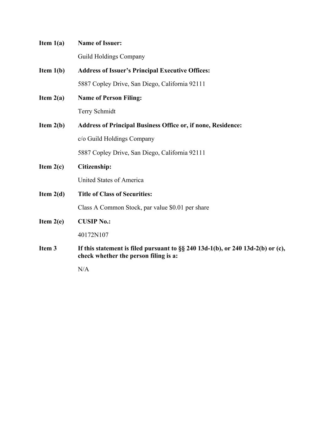 Item 1(a) Name of Issuer: Guild Holdings Company Item 1(b) Address of Issuer’s Principal Executive Offices: 5887 Copley Drive, San Diego, California 92111 Item 2(a) Name of Person Filing: Terry Schmidt Item 2(b) Address of Principal Business Office or, if none, Residence: c/o Guild Holdings Company 5887 Copley Drive, San Diego, California 92111 Item 2(c) Citizenship: United States of America Item 2(d) Title of Class of Securities: Class A Common Stock, par value $0.01 per share Item 2(e) CUSIP No.: 40172N107 Item 3 If this statement is filed pursuant to §§ 240 13d-1(b), or 240 13d-2(b) or (c), check whether the person filing is a: N/A