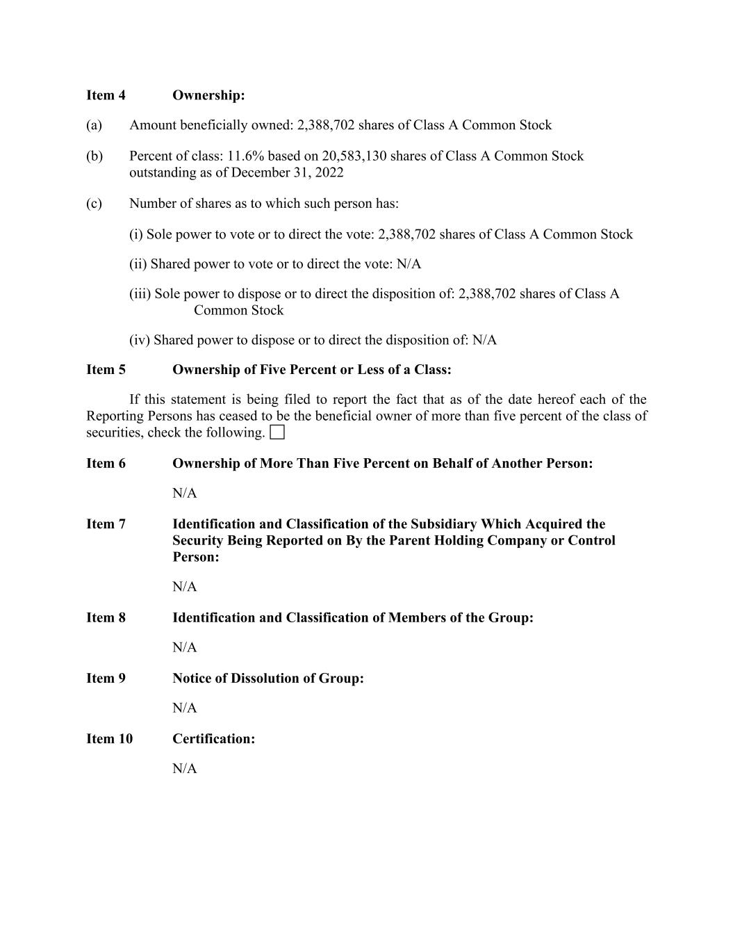 Item 4 Ownership: (a) Amount beneficially owned: 2,388,702 shares of Class A Common Stock (b) Percent of class: 11.6% based on 20,583,130 shares of Class A Common Stock outstanding as of December 31, 2022 (c) Number of shares as to which such person has: (i) Sole power to vote or to direct the vote: 2,388,702 shares of Class A Common Stock (ii) Shared power to vote or to direct the vote: N/A (iii) Sole power to dispose or to direct the disposition of: 2,388,702 shares of Class A Common Stock (iv) Shared power to dispose or to direct the disposition of: N/A Item 5 Ownership of Five Percent or Less of a Class: If this statement is being filed to report the fact that as of the date hereof each of the Reporting Persons has ceased to be the beneficial owner of more than five percent of the class of securities, check the following. Item 6 Ownership of More Than Five Percent on Behalf of Another Person: N/A Item 7 Identification and Classification of the Subsidiary Which Acquired the Security Being Reported on By the Parent Holding Company or Control Person: N/A Item 8 Identification and Classification of Members of the Group: N/A Item 9 Notice of Dissolution of Group: N/A Item 10 Certification: N/A