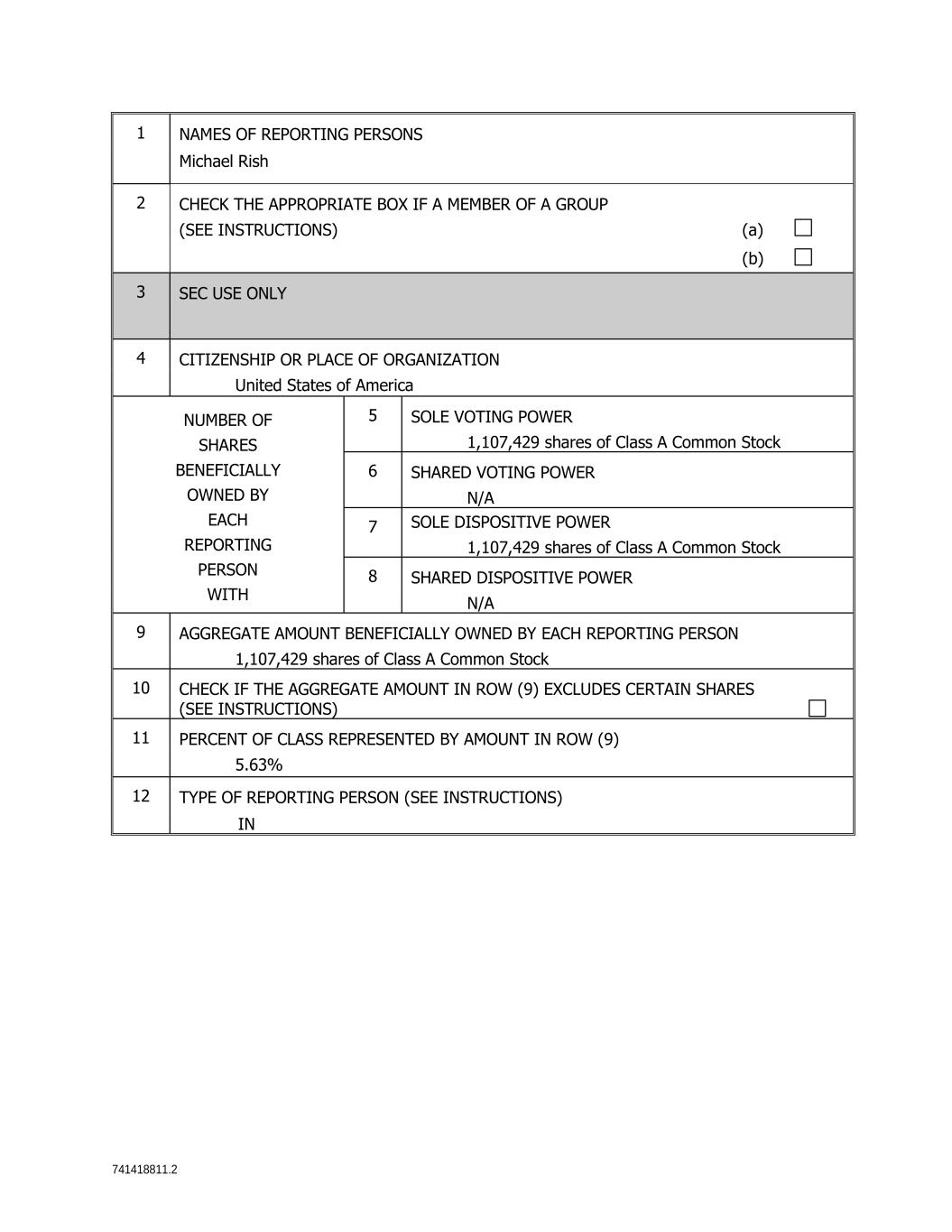 741418811.2 1 NAMES OF REPORTING PERSONS Michael Rish 2 CHECK THE APPROPRIATE BOX IF A MEMBER OF A GROUP (SEE INSTRUCTIONS) (a) (b) 3 SEC USE ONLY 4 CITIZENSHIP OR PLACE OF ORGANIZATION United States of America NUMBER OF SHARES BENEFICIALLY OWNED BY EACH REPORTING PERSON WITH 5 SOLE VOTING POWER 1,107,429 shares of Class A Common Stock 6 SHARED VOTING POWER N/A 7 SOLE DISPOSITIVE POWER 1,107,429 shares of Class A Common Stock 8 SHARED DISPOSITIVE POWER N/A 9 AGGREGATE AMOUNT BENEFICIALLY OWNED BY EACH REPORTING PERSON 1,107,429 shares of Class A Common Stock 10 CHECK IF THE AGGREGATE AMOUNT IN ROW (9) EXCLUDES CERTAIN SHARES (SEE INSTRUCTIONS) 11 PERCENT OF CLASS REPRESENTED BY AMOUNT IN ROW (9) 5.63% 12 TYPE OF REPORTING PERSON (SEE INSTRUCTIONS) IN