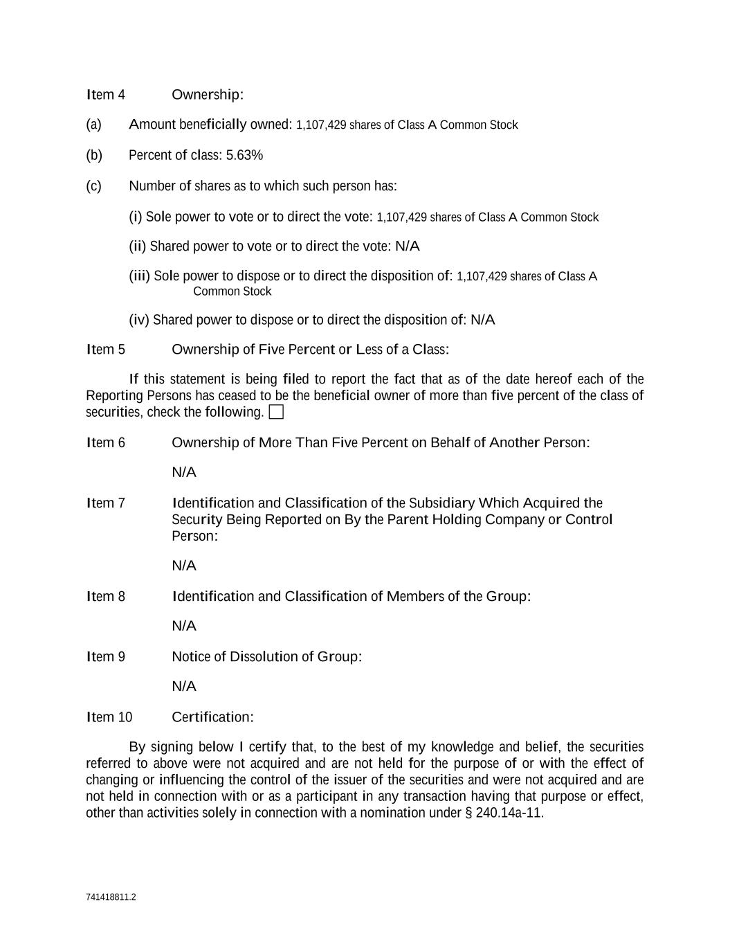741418811.2 Item 4 Ownership: (a) Amount beneficially owned: 1,107,429 shares of Class A Common Stock (b) Percent of class: 5.63% (c) Number of shares as to which such person has: (i) Sole power to vote or to direct the vote: 1,107,429 shares of Class A Common Stock (ii) Shared power to vote or to direct the vote: N/A (iii) Sole power to dispose or to direct the disposition of: 1,107,429 shares of Class A Common Stock (iv) Shared power to dispose or to direct the disposition of: N/A Item 5 Ownership of Five Percent or Less of a Class: If this statement is being filed to report the fact that as of the date hereof each of the Reporting Persons has ceased to be the beneficial owner of more than five percent of the class of securities, check the following. Item 6 Ownership of More Than Five Percent on Behalf of Another Person: N/A Item 7 Identification and Classification of the Subsidiary Which Acquired the Security Being Reported on By the Parent Holding Company or Control Person: N/A Item 8 Identification and Classification of Members of the Group: N/A Item 9 Notice of Dissolution of Group: N/A Item 10 Certification: By signing below I certify that, to the best of my knowledge and belief, the securities referred to above were not acquired and are not held for the purpose of or with the effect of changing or influencing the control of the issuer of the securities and were not acquired and are not held in connection with or as a participant in any transaction having that purpose or effect, other than activities solely in connection with a nomination under § 240.14a-11.