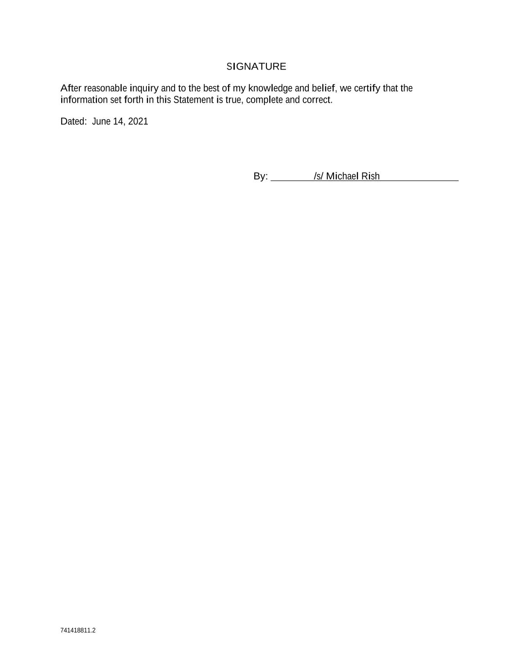 741418811.2 SIGNATURE After reasonable inquiry and to the best of my knowledge and belief, we certify that the information set forth in this Statement is true, complete and correct. Dated: June 14, 2021 By: /s/ Michael Rish