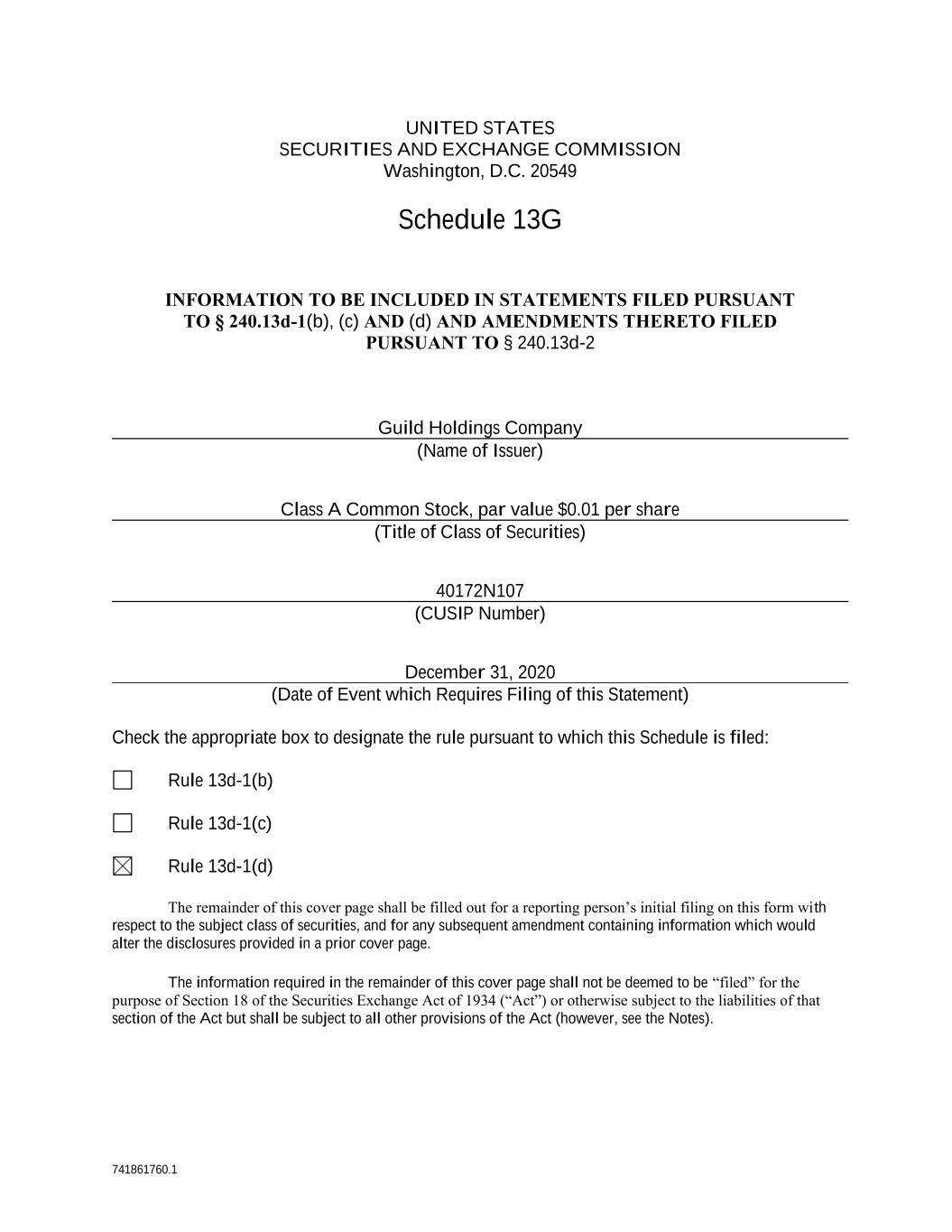 741861760.1 UNITED STATES SECURITIES AND EXCHANGE COMMISSION Washington, D.C. 20549 Schedule 13G INFORMATION TO BE INCLUDED IN STATEMENTS FILED PURSUANT TO § 240.13d-1(b), (c) AND (d) AND AMENDMENTS THERETO FILED PURSUANT TO § 240.13d-2 Guild Holdings Company (Name of Issuer) Class A Common Stock, par value $0.01 per share (Title of Class of Securities) 40172N107 (CUSIP Number) December 31, 2020 (Date of Event which Requires Filing of this Statement) Check the appropriate box to designate the rule pursuant to which this Schedule is filed: Rule 13d-1(b) Rule 13d-1(c) Rule 13d-1(d) The remainder of this cover page shall be filled out for a reporting person’s initial filing on this form with respect to the subject class of securities, and for any subsequent amendment containing information which would alter the disclosures provided in a prior cover page. The information required in the remainder of this cover page shall not be deemed to be “filed” for the purpose of Section 18 of the Securities Exchange Act of 1934 (“Act”) or otherwise subject to the liabilities of that section of the Act but shall be subject to all other provisions of the Act (however, see the Notes).