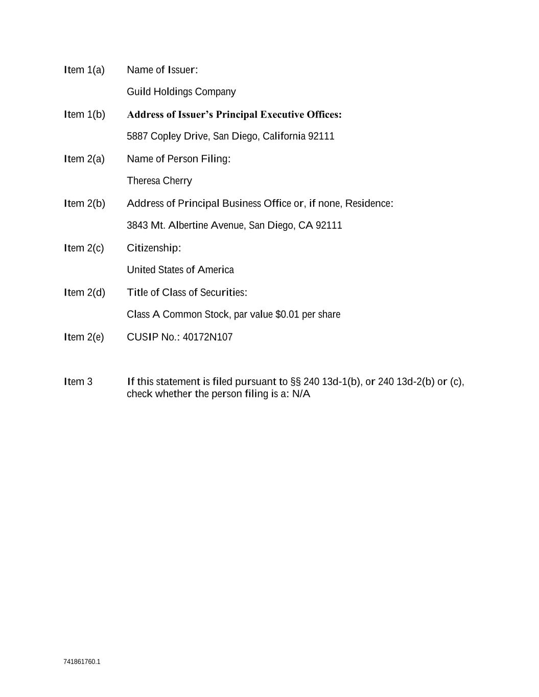 741861760.1 Item 1(a) Name of Issuer: Guild Holdings Company Item 1(b) Address of Issuer’s Principal Executive Offices: 5887 Copley Drive, San Diego, California 92111 Item 2(a) Name of Person Filing: Theresa Cherry Item 2(b) Address of Principal Business Office or, if none, Residence: 3843 Mt. Albertine Avenue, San Diego, CA 92111 Item 2(c) Citizenship: United States of America Item 2(d) Title of Class of Securities: Class A Common Stock, par value $0.01 per share Item 2(e) CUSIP No.: 40172N107 Item 3 If this statement is filed pursuant to §§ 240 13d-1(b), or 240 13d-2(b) or (c), check whether the person filing is a: N/A